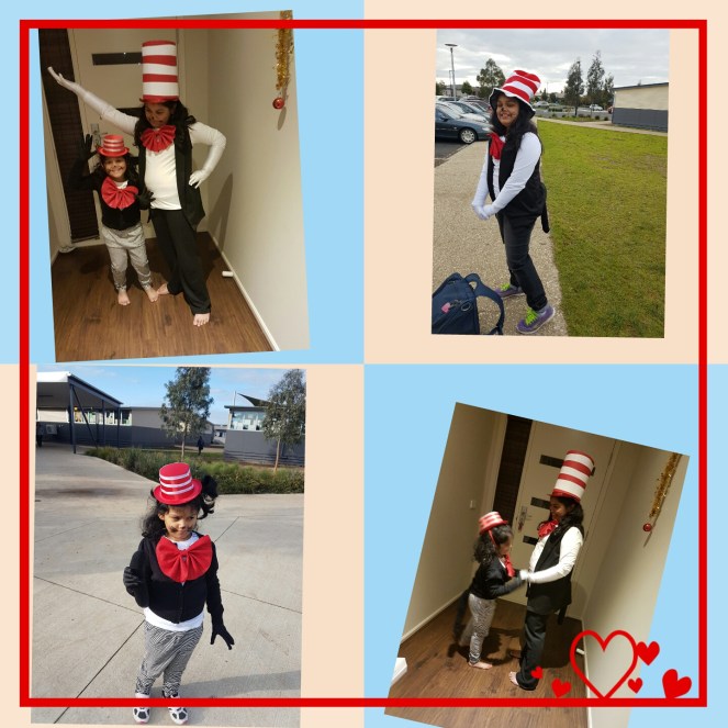 Oh! We celebrated Book Week last week and the girls dressed up as’ Cat in the Hat’ from Dr.Suess. I had so much fun putting their costumes, together ☺
