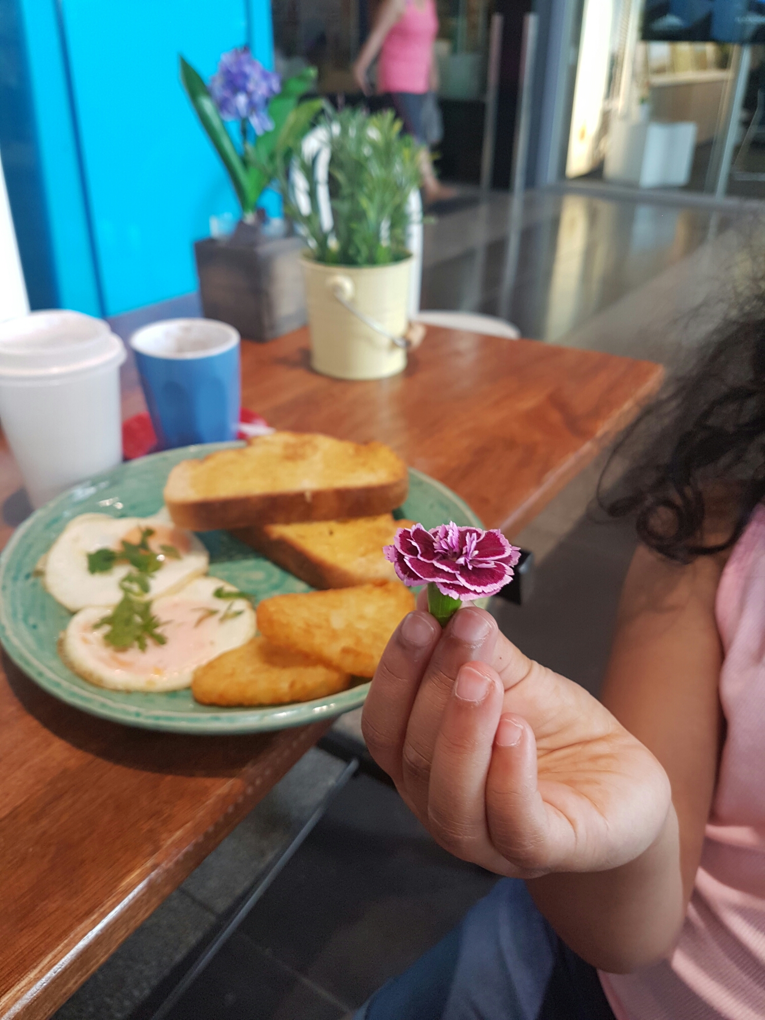 She loves placing orders at a restaurant or cafe now. She also loves the color blue, so she requested her babycino in a blue cup. I love it that the staff at this particular cafe indulge her – until a few days back, she loved the color orange. As soon as we go up to order, they confirm the color and always bring her drink out in a cup of her choice.