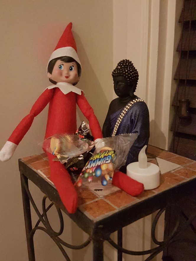 Day 2 – Elfie got in to candy stash and then decided to hang out with our Buddha !